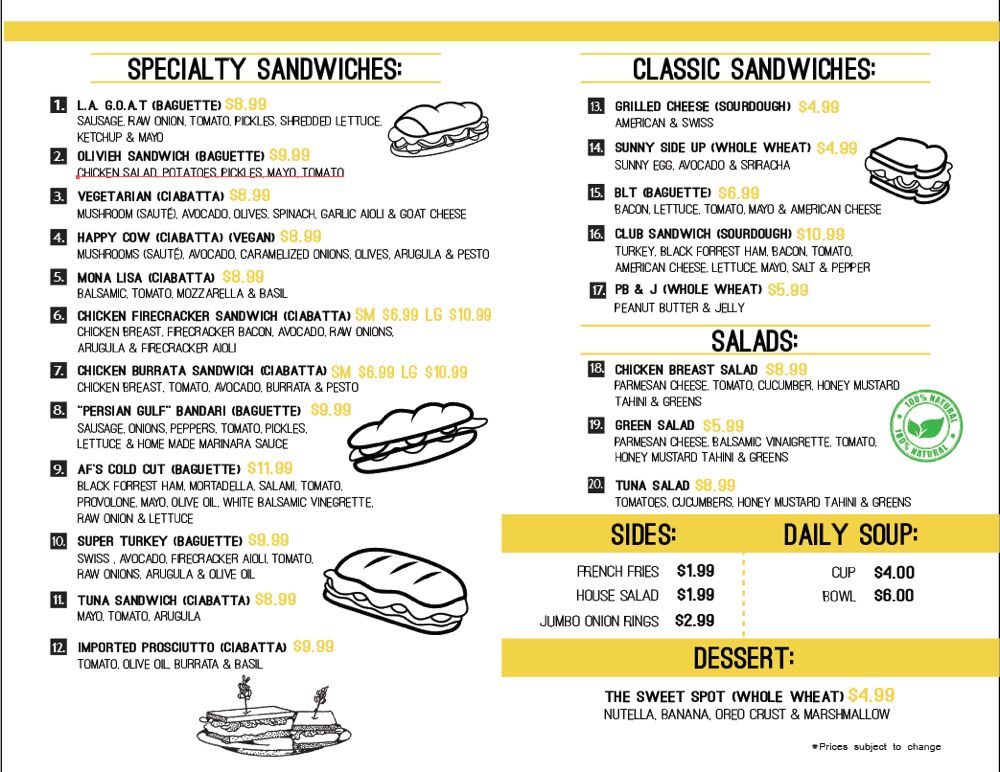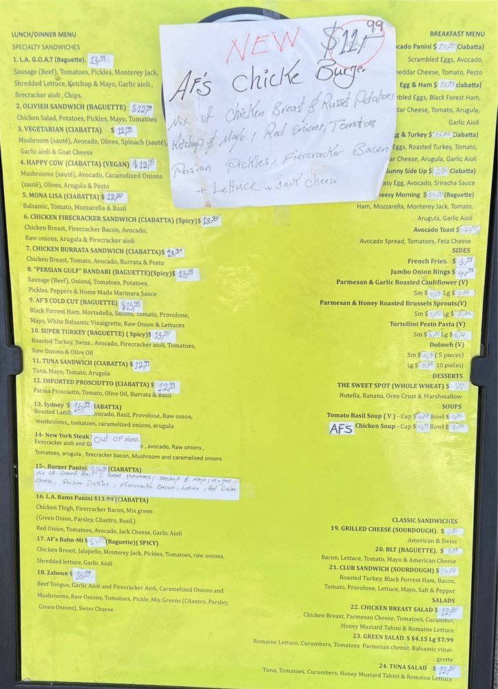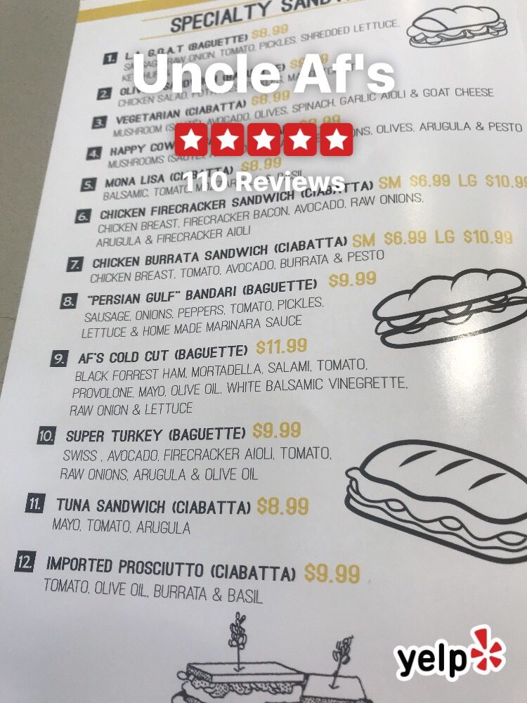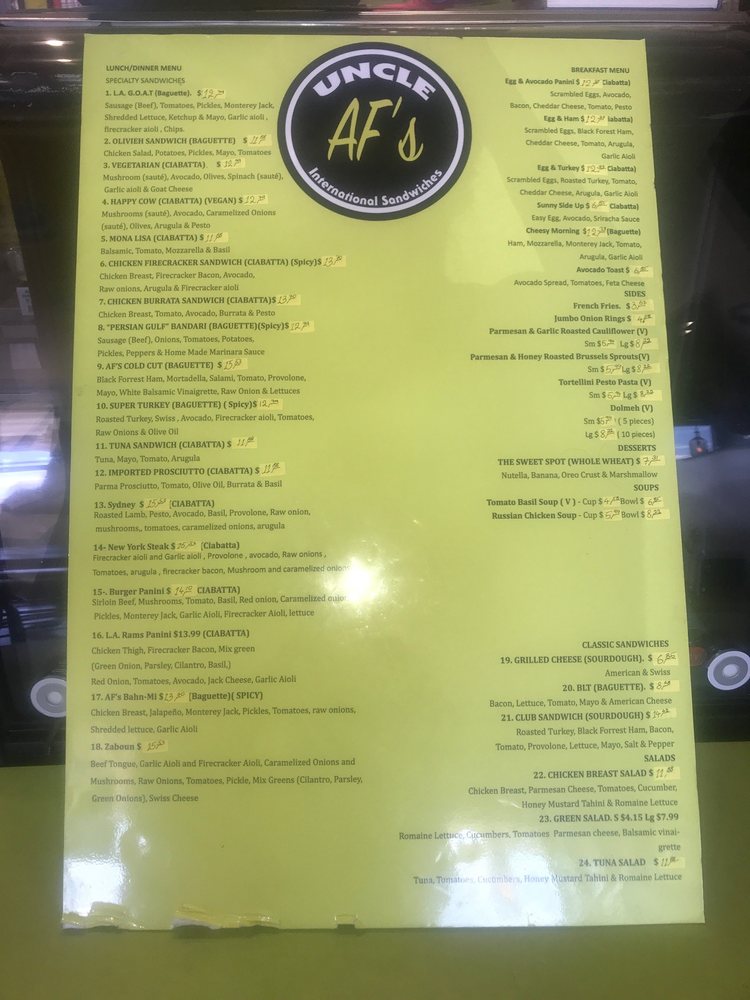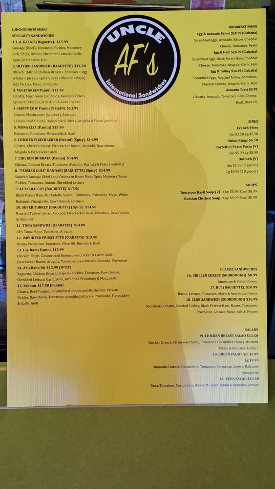 Introducing Uncle Af’s, a hidden gem located in Agoura Hills, CA, offering a diverse menu of classic sandwiches and delectable breakfast options, all served with a side of exceptional service. With a range of beverages from Arrowhead water to specialty teas, this restaurant caters to every taste. Customers rave about the Grilled Cheese Sandwich, BLT Sandwich, and Egg & Avocado Panini. The reviews speak for themselves, praising the quality and flavor of the food, as well as the welcoming atmosphere created by the owner and staff. Whether you're a sandwich enthusiast or looking for a delicious breakfast, Uncle Af’s is a must-visit destination for food lovers.